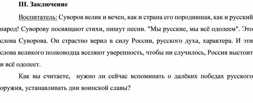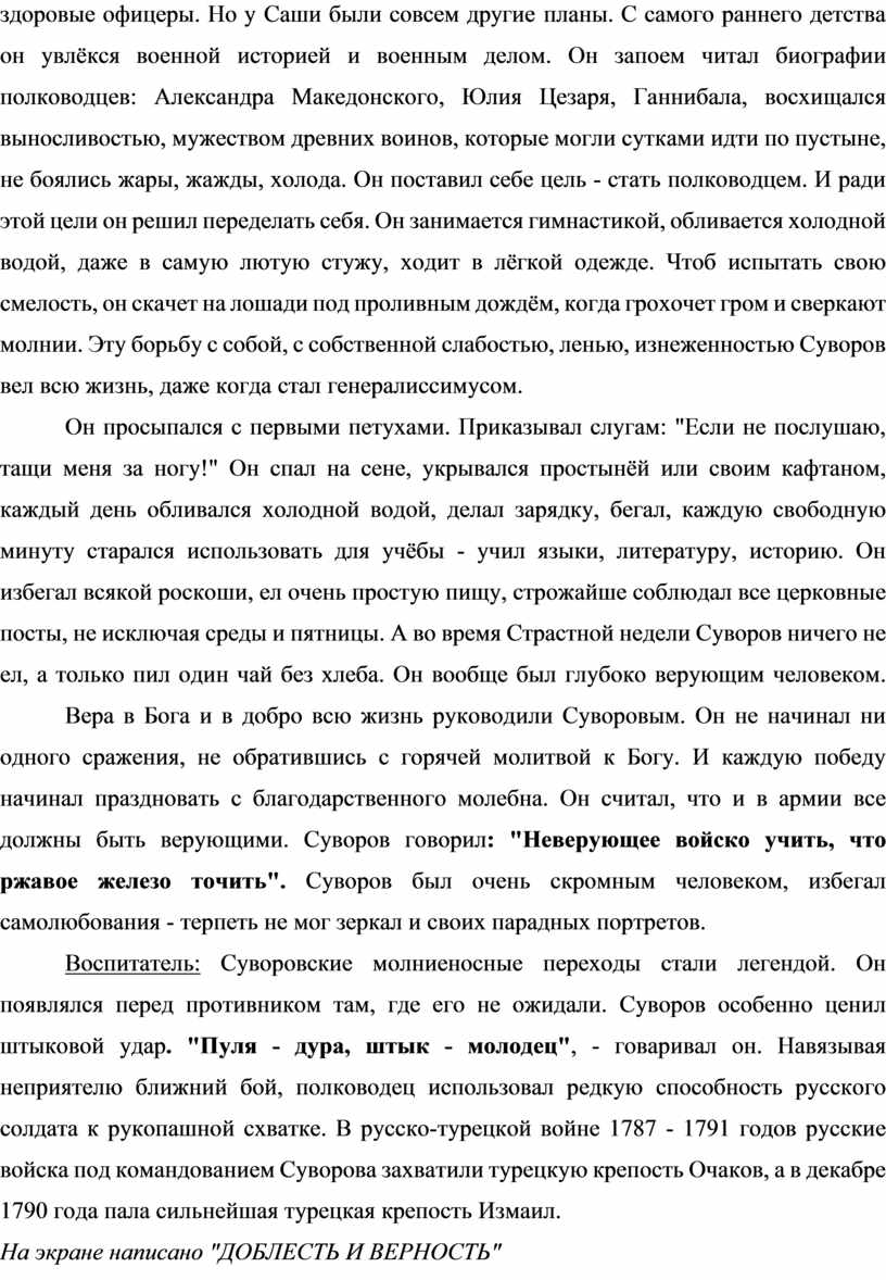 Воспитатель: Суворов велик и вечен, как и страна его породившая, как и русский народ! Суворову посвящают стихи, пишут песни. "Мы русские, мы всё одолеем". Это слова Суворова. Он страстно верил в силу России, русского духа, характера. И эти слова великого полководца вселяют уверенность, чтобы ни случилось, Россия выстоит и всё одолеет.