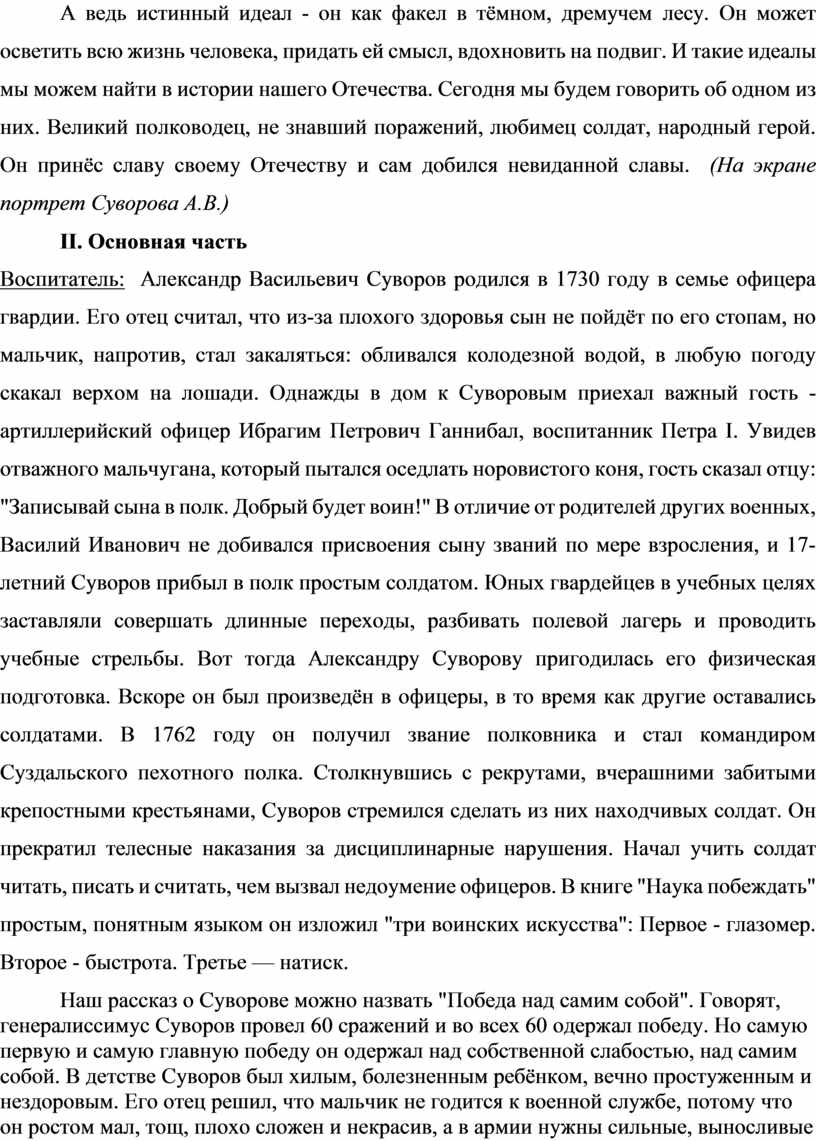Воспитатель: Александр Васильевич Суворов родился в 1730 году в семье офицера гвардии. Его отец считал, что из-за плохого здоровья сын не пойдёт по его стопам, но мальчик, напротив, стал закаляться: обливался колодезной водой, в любую погоду скакал верхом на лошади. Однажды в дом к Суворовым приехал важный гость - артиллерийский офицер Ибрагим Петрович Ганнибал, воспитанник Петра I. Увидев отважного мальчугана, который пытался оседлать норовистого коня, гость сказал отцу: "Записывай сына в полк. Добрый будет воин!" В отличие от родителей других военных, Василий Иванович не добивался присвоения сыну званий по мере взросления, и 17-летний Суворов прибыл в полк простым солдатом. Юных гвардейцев в учебных целях заставляли совершать длинные переходы, разбивать полевой лагерь и проводить учебные стрельбы. Вот тогда Александру Суворову пригодилась его физическая подготовка. Вскоре он был произведён в офицеры, в то время как другие оставались солдатами. В 1762 году он получил звание полковника и стал командиром Суздальского пехотного полка. Столкнувшись с рекрутами, вчерашними забитыми крепостными крестьянами, Суворов стремился сделать из них находчивых солдат. Он прекратил телесные наказания за дисциплинарные нарушения. Начал учить солдат читать, писать и считать, чем вызвал недоумение офицеров. В книге "Наука побеждать" простым, понятным языком он изложил "три воинских искусства": Первое - глазомер. Второе - быстрота. Третье — натиск.