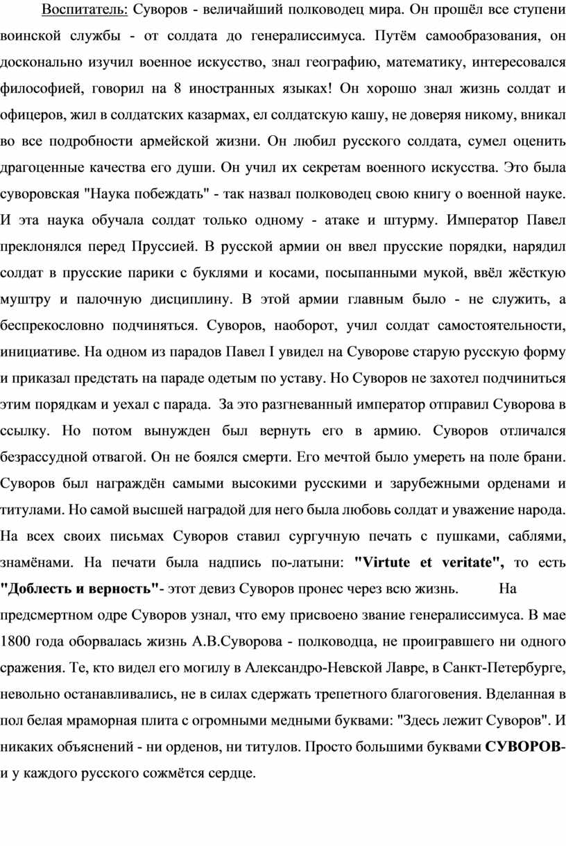 Воспитатель: Суворов - величайший полководец мира. Он прошёл все ступени воинской службы - от солдата до генералиссимуса. Путём самообразования, он досконально изучил военное искусство, знал географию, математику, интересовался философией, говорил на 8 иностранных языках! Он хорошо знал жизнь солдат и офицеров, жил в солдатских казармах, ел солдатскую кашу, не доверяя никому, вникал во все подробности армейской жизни. Он любил русского солдата, сумел оценить драгоценные качества его души. Он учил их секретам военного искусства. Это была суворовская "Наука побеждать" - так назвал полководец свою книгу о военной науке. И эта наука обучала солдат только одному - атаке и штурму. Император Павел преклонялся перед Пруссией. В русской армии он ввел прусские порядки, нарядил солдат в прусские парики с буклями и косами, посыпанными мукой, ввёл жёсткую муштру и палочную дисциплину. В этой армии главным было - не служить, а беспрекословно подчиняться. Суворов, наоборот, учил солдат самостоятельности, инициативе. На одном из парадов Павел I увидел на Суворове старую русскую форму и приказал предстать на параде одетым по уставу. Но Суворов не захотел подчиниться этим порядкам и уехал с парада. За это разгневанный император отправил Суворова в ссылку. Но потом вынужден был вернуть его в армию. Суворов отличался безрассудной отвагой. Он не боялся смерти. Его мечтой было умереть на поле брани. Суворов был награждён самыми высокими русскими и зарубежными орденами и титулами. Но самой высшей наградой для него была любовь солдат и уважение народа. На всех своих письмах Суворов ставил сургучную печать с пушками, саблями, знамёнами. На печати была надпись по-латыни: "Virtute et veritate", то есть "Доблесть и верность"- этот девиз Суворов пронес через всю жизнь. На предсмертном одре Суворов узнал, что ему присвоено звание генералиссимуса. В мае 1800 года оборвалась жизнь А.В.Суворова - полководца, не проигравшего ни одного сражения. Те, кто видел его могилу в Александро-Невской Лавре, в Санкт-Петербурге, невольно останавливались, не в силах сдержать трепетного благоговения. Вделанная в пол белая мраморная плита с огромными медными буквами: "Здесь лежит Суворов". И никаких объяснений - ни орденов, ни титулов. Просто большими буквами СУВОРОВ- и у каждого русского сожмётся сердце.