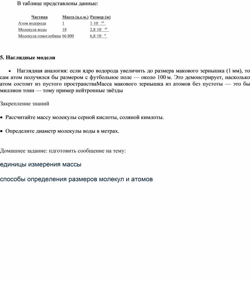 Цели урока: дать представление обучающимся о размерах и массах молекул и атомов, научить решать задачи по вычислению основных физических величин молекулярно-кинетической теории, характеристик молекул и атомов; провести контроль знаний по теме.