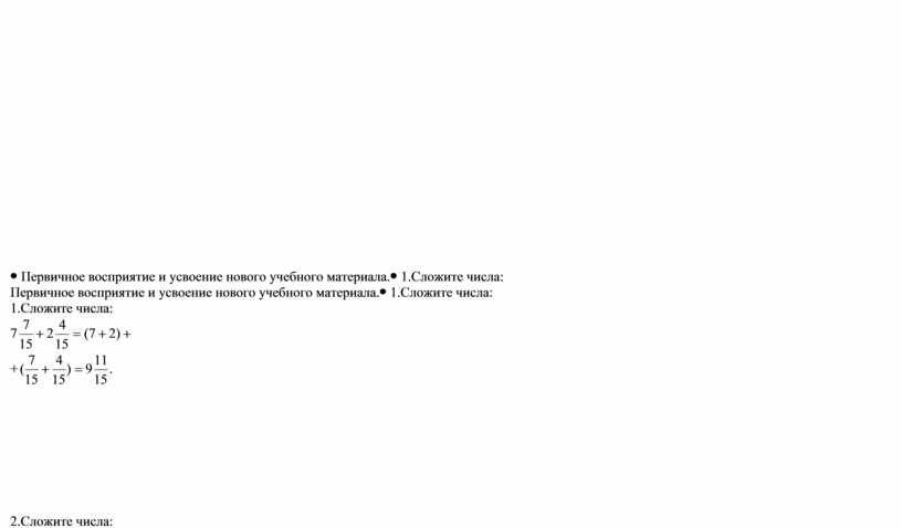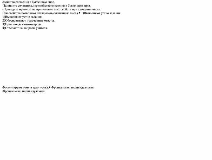 Предлагает диалог: -Расскажите, как складываются числа, когда дробные части имеют одинаковые знаменатели? -Какие свойства сложения были использованы?