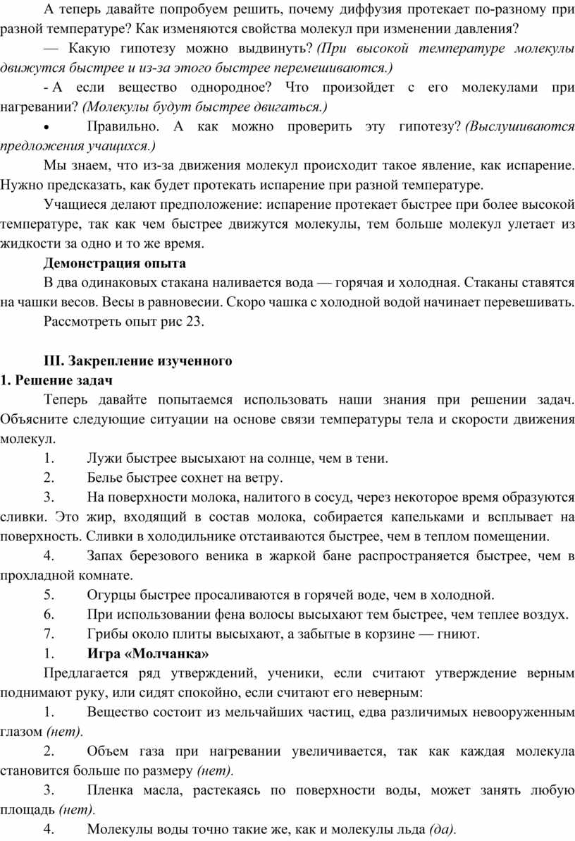 - А если вещество однородное? Что произойдет с его молекулами при нагревании? (Молекулы будут быстрее двигаться.)
