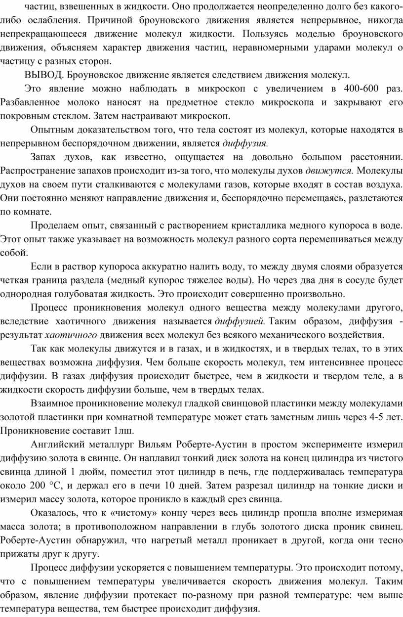 Цели урока: познакомить учащихся с диффузией; научить объяснять явление диффузии и скорость ее протекания в зависимости от температуры тела;