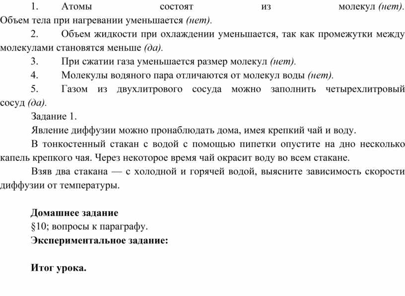 6. Объем жидкости при охлаждении уменьшается, так как промежутки между молекулами становятся меньше (да).