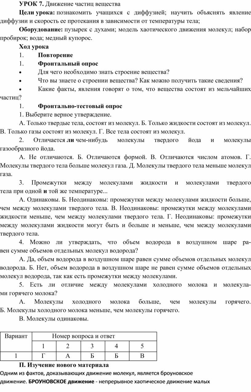 Оборудование: пузырек с духами; модель хаотического движения молекул; набор пробирок; вода; медный купорос.