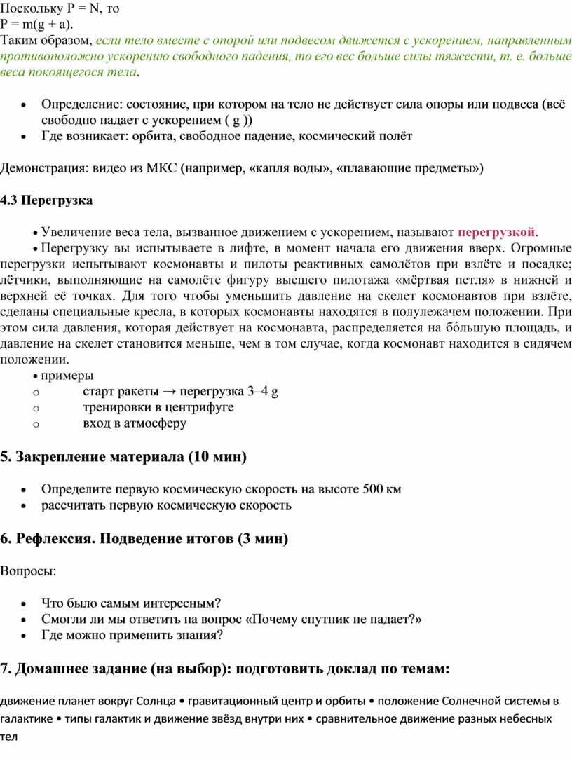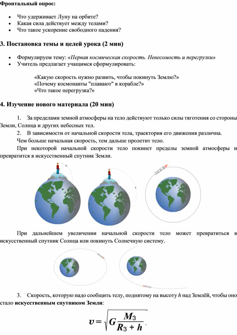 Ппоурочная разработка урока по теме «Первая космическая скорость. Невесомость и перегрузки» (физика, 9 класс) в соответствии с требованиями ФГОС ООО (основного общего образования), ориентированная на УМК А. В. Перышкина.