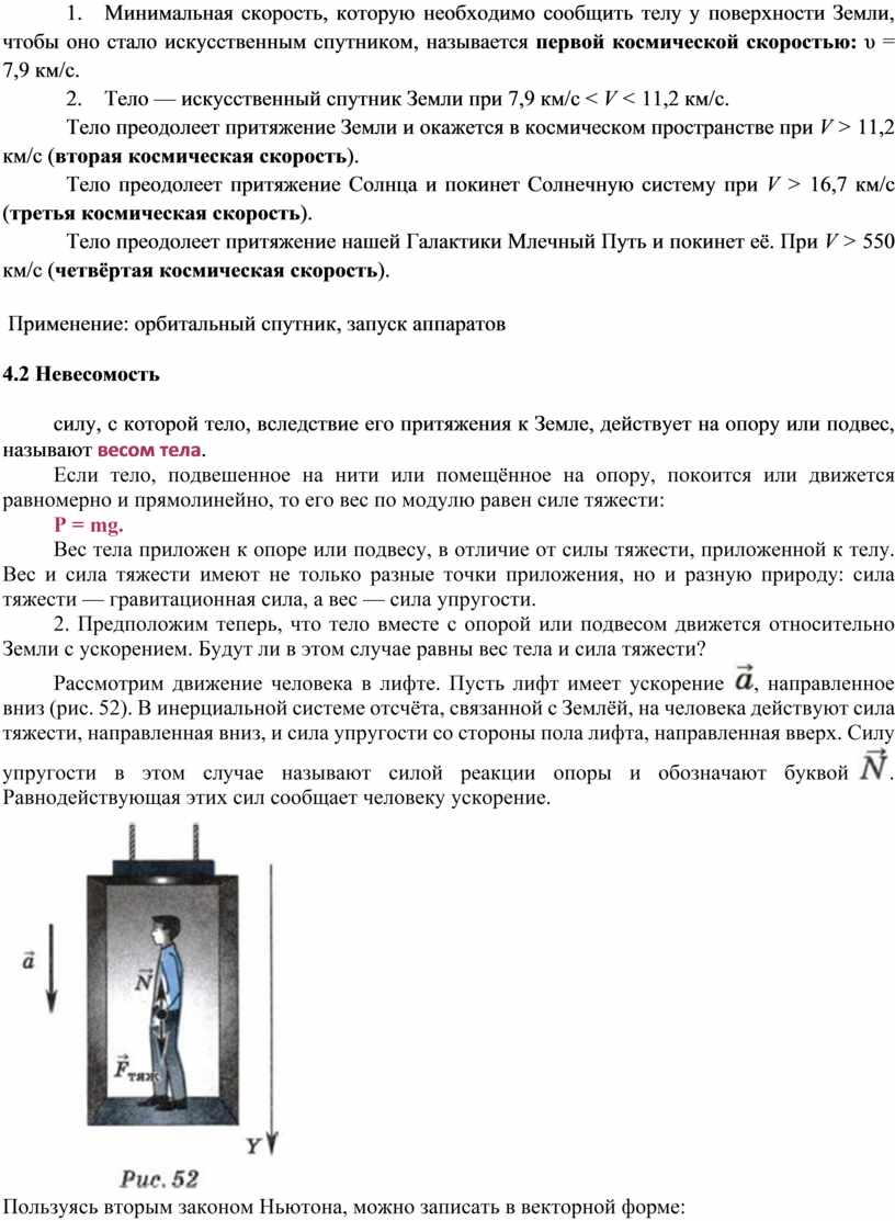 Если ускорение тела равно ускорению свободного падения а = g, то вес тела Р = 0. Такое состояние называют состоянием невесомости. В состоянии невесомости пребывают космонавты в космическом корабле во время полёта, поскольку они движутся вокруг Земли с центростремительным ускорением, равным ускорению свободного падения.