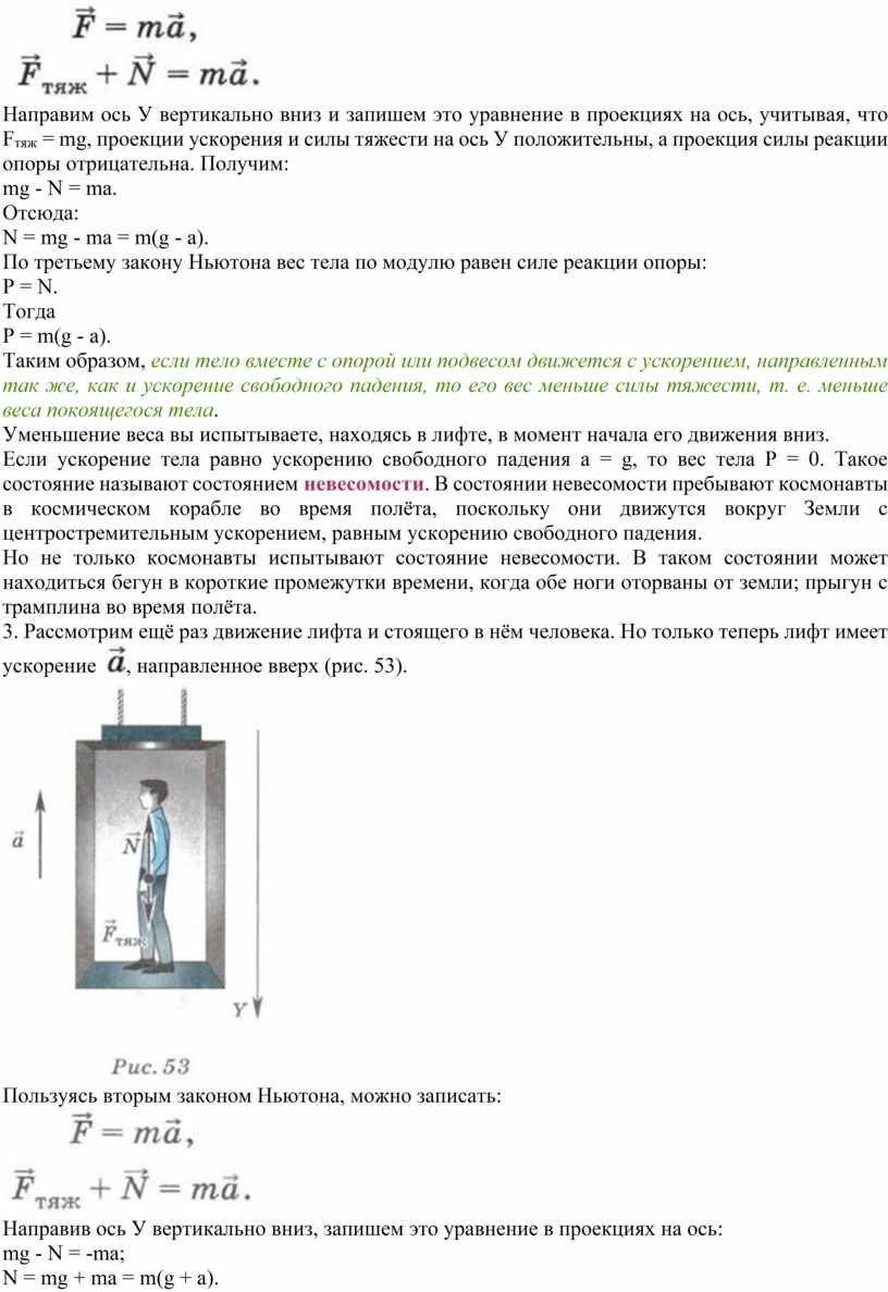 Таким образом, если тело вместе с опорой или подвесом движется с ускорением, направленным так же, как и ускорение свободного падения, то его вес меньше силы тяжести, т. е. меньше веса покоящегося тела.