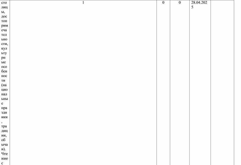 Родная страна и страна (страны) изучаемого языка. Их географическое положение, столицы, достопримечательности, культурные особенности (национальные праздники, традиции, обычаи). Чтение несплошных текстов (таблиц) и понимание представленной в них информации. |