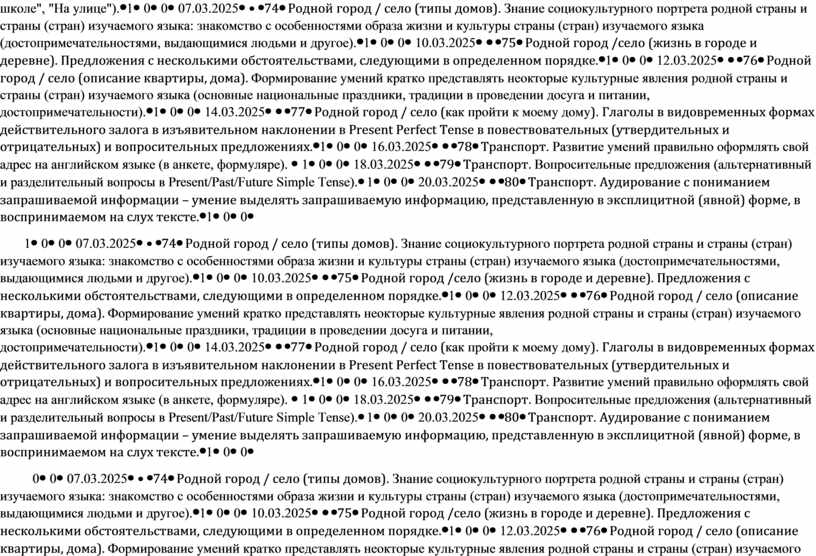 Родной город / село (как пройти к моему дому). Глаголы в видовременных формах действительного залога в изъявительном наклонении в Present Perfect Tense в повествовательных (утвердительных и отрицательных) и вопросительных предложениях. |