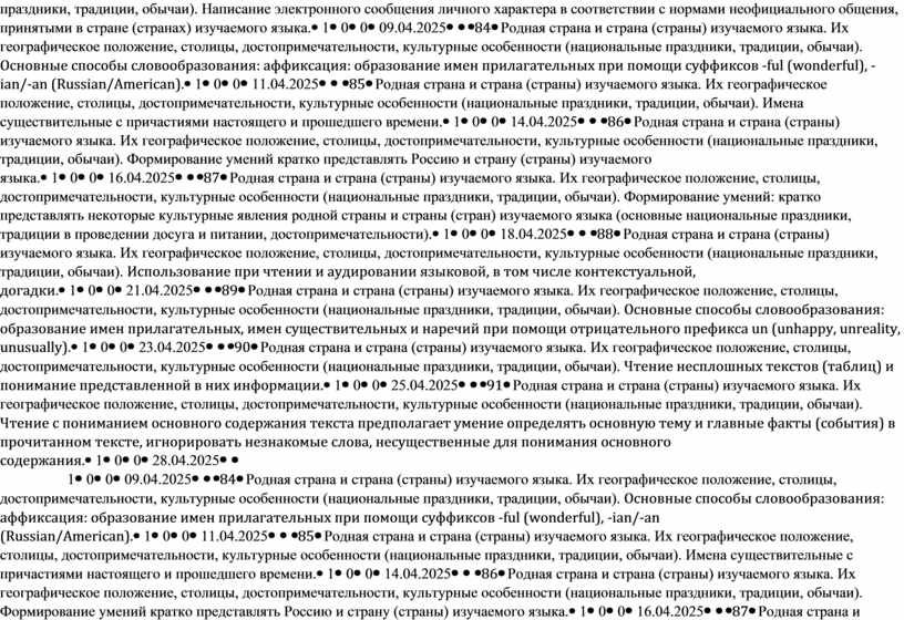 Родная страна и страна (страны) изучаемого языка. Их географическое положение, столицы, достопримечательности, культурные особенности (национальные праздники, традиции, обычаи). Основные способы словообразования: образование имен прилагательных, имен существительных и наречий при помощи отрицательного префикса un (unhappy, unreality, unusually). |