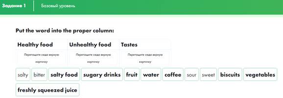 После распределения слов по колонкам можно дать дополнительное задание: What food do you like? What does it taste?