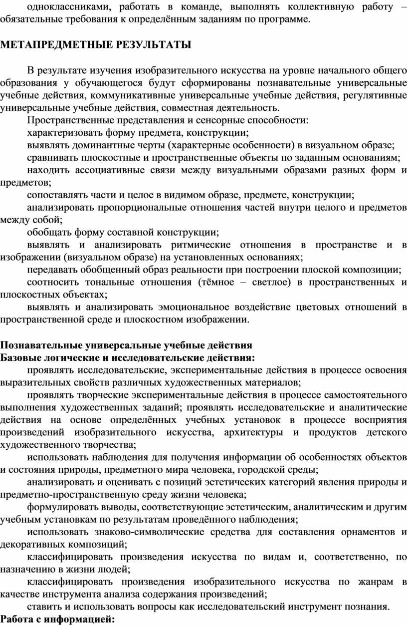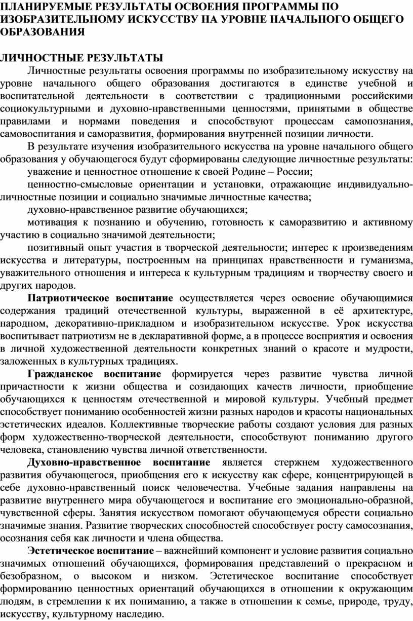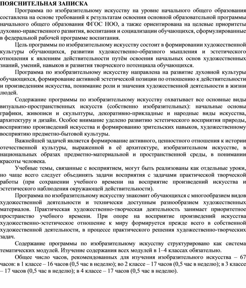 Программа по изобразительному искусству на уровне начального общего образования составлена на основе требований к результатам освоения основной образовательной программы начального общего образования ФГОС НОО, а также ориентирована на целевые приоритеты духовно-нравственного развития, воспитания и социализации обучающихся, сформулированные в федеральной рабочей программе воспитания.