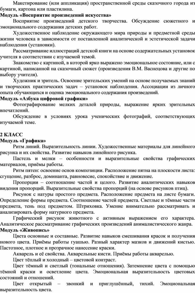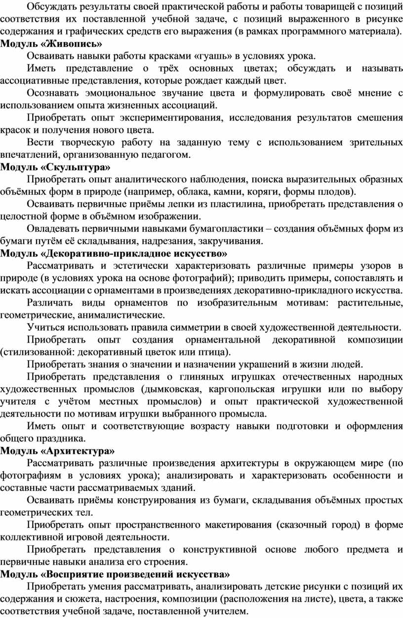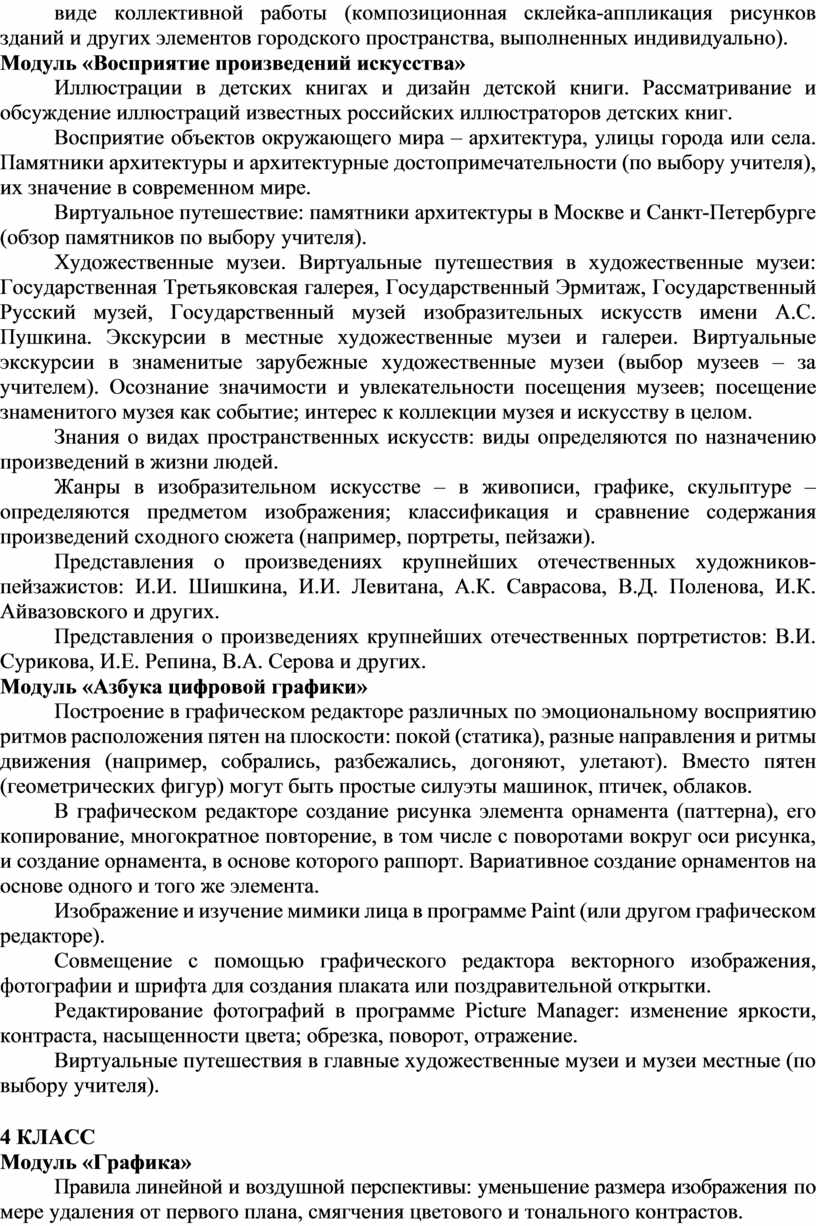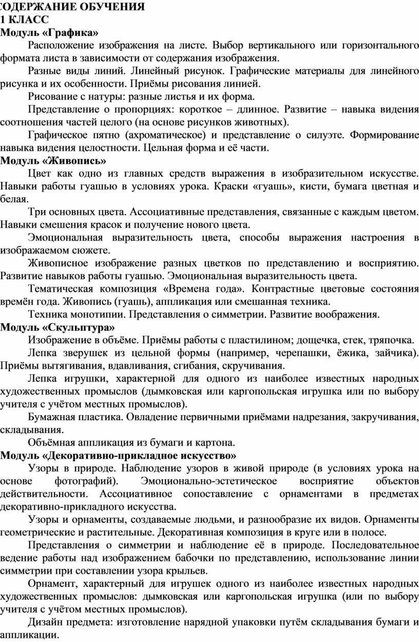 Содержание программы по изобразительному искусству структурировано как система тематических модулей. Изучение содержания всех модулей в 1–4 классах обязательно.