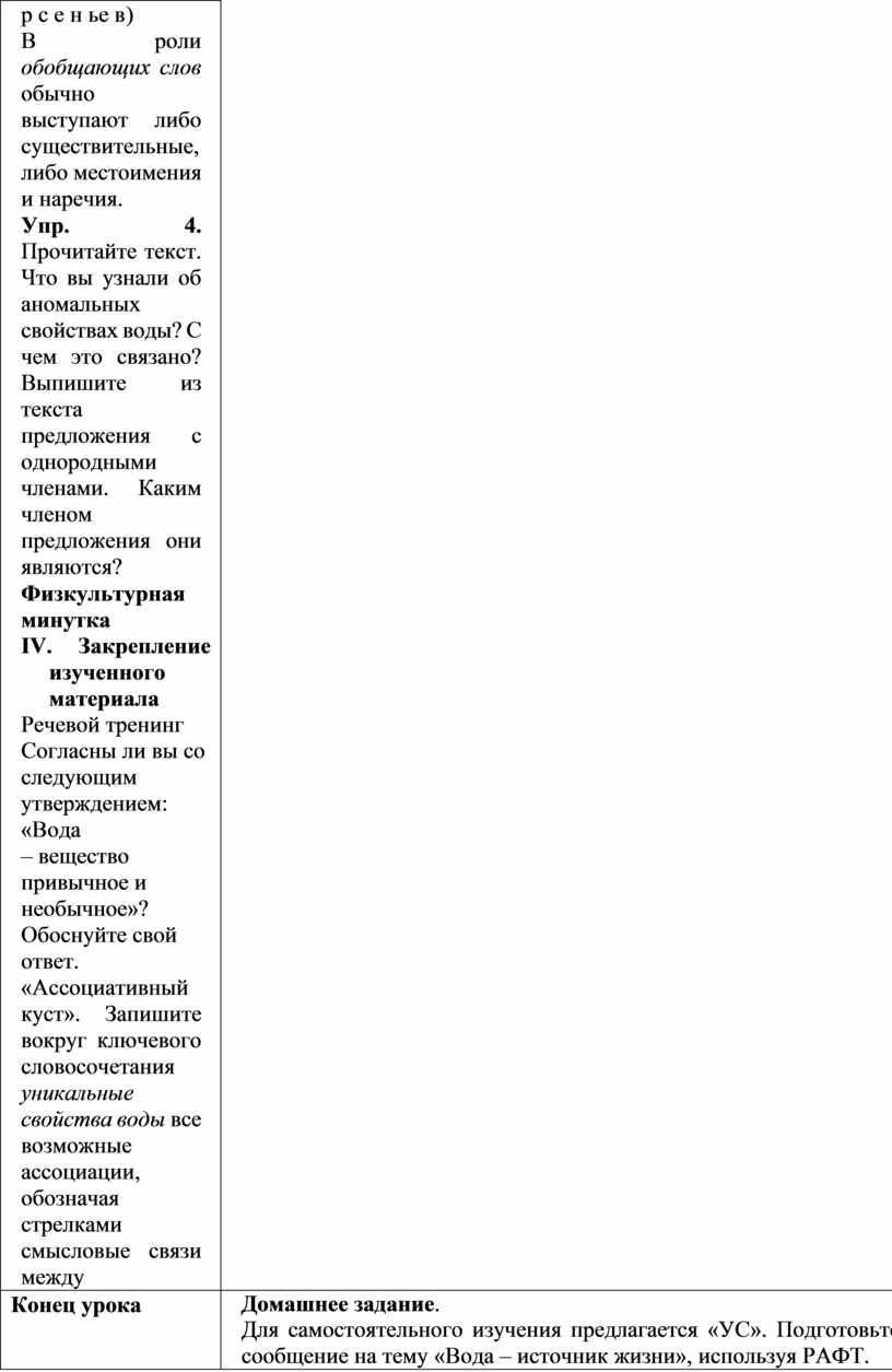 II. Актуализация знаний. Прочитайте загадку. Скажите, о чем идёт речь? Как вы думаете, о каких уникальных свойствах воды мы будем с вами говорить на уроке? (Деятельность учащихся) К Прогнозирование учащимися темы урока Упр. 1. Прочитайте текст. Озаглавьте его. О каких особенностях воды, говорится в нем? Какие ключевые словосочетания указывают на особое свойство воды? Объясните их значение. Ученики записывают в тетрадь основные понятия,составляют «Ментальную карту» по тексту. Упр. 2. Спишите предложения, расставляя знаки препинания в предложениях с обобщающими словами при однородных членах предложения. Подчеркните обобщающиеслова. Приём «Ментальная карта». II. Изучение нового материала. Упр. 3. Прочитать текст «Вода – вещество привычное и необычное».Что вы узнали из текста? Соответствует ли его название содержанию? Выпишите предложение с обобщающим словом, стоящим перед однородными членами. Составьте его схему. Работа над развитием устной связной речи. Согласны ли вы с утверждением: «Вода – вещество привычное и необычное»? Обоснуйте свой ответ. (Деятельность учащихся) К Отвечают на вопросы, приводят свои аргументы,доказывают. Учимся применять правила! Обобщающее слово – это слово или словосочетание, которое является общим обозначением находящихся при нём однородныхчленов. Обобщающие слова могут стоять перед однородными членами или после них: 1) Все было непривлекательно: небо, и озеро, и пасмурные дали, и низкий остров. (К. П а у с т о в- с к и й). 2) Теперь уже ни гор, ни неба, ни земли – ничего не было видно. (В. А р с е н ье в) В роли обобщающих слов обычно выступают либо существительные, либо местоимения и наречия. Упр. 4. Прочитайте текст. Что вы узнали об аномальных свойствах воды? С чем это связано? Выпишите из текста предложения с однородными членами. Каким членом предложения они являются? Физкультурная минутка IV. Закрепление изученного материала Речевой тренинг Согласны ли вы со следующим утверждением: «Вода – вещество привычное и необычное»? Обоснуйте свой ответ. «Ассоциативный куст». Запишите вокруг ключевого словосочетания уникальные свойства воды все возможные ассоциации, обозначая стрелками смысловые связи между |