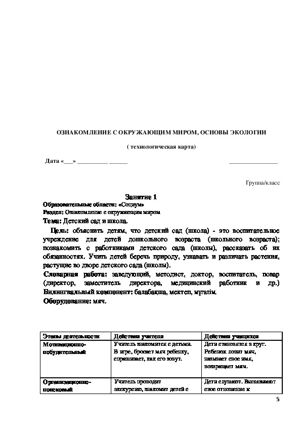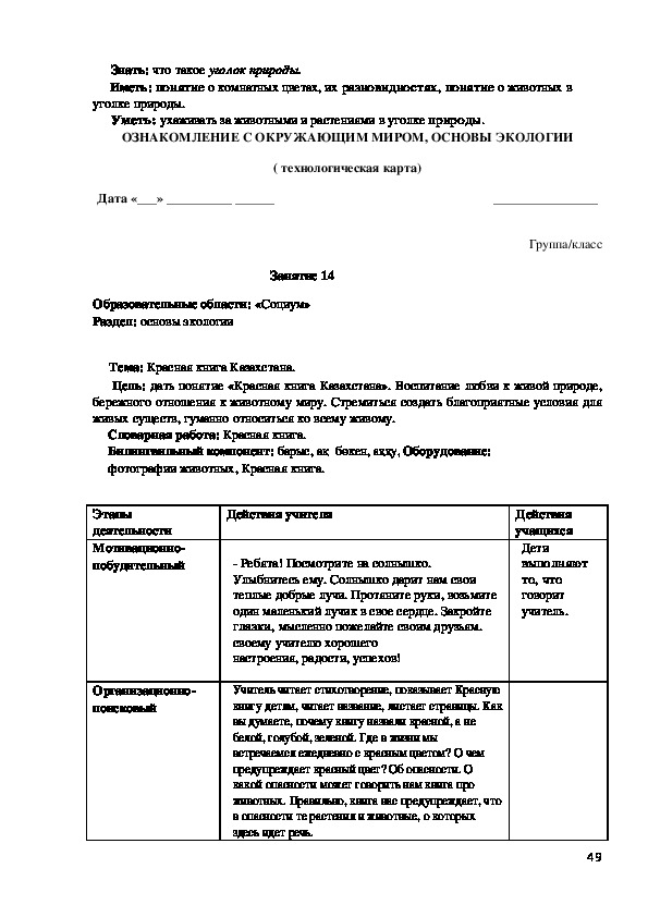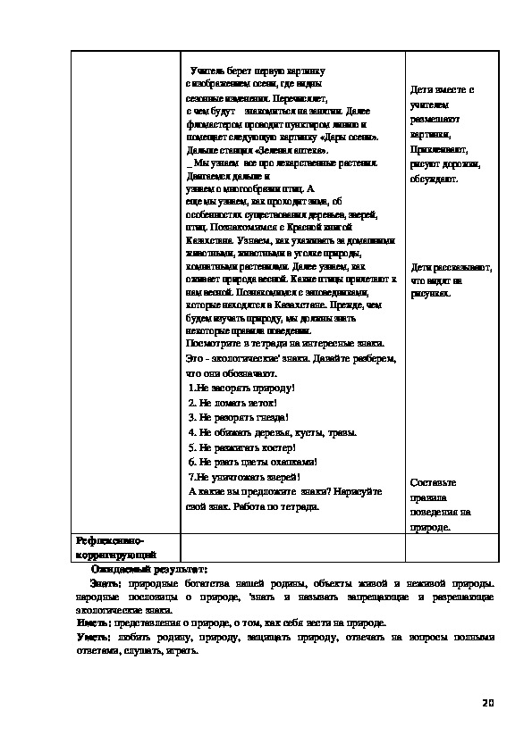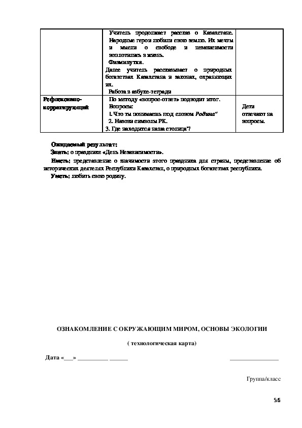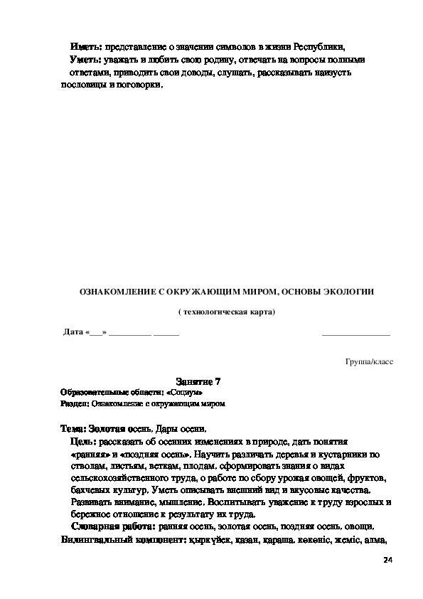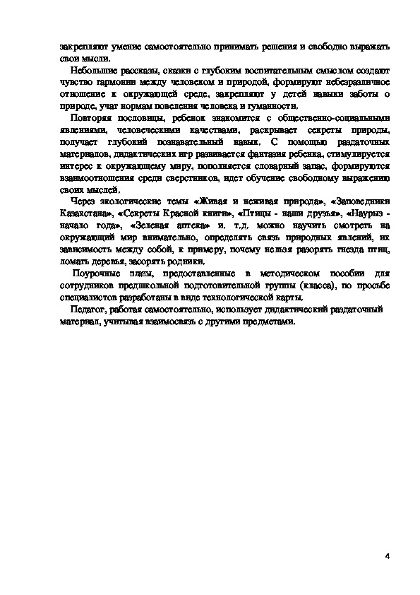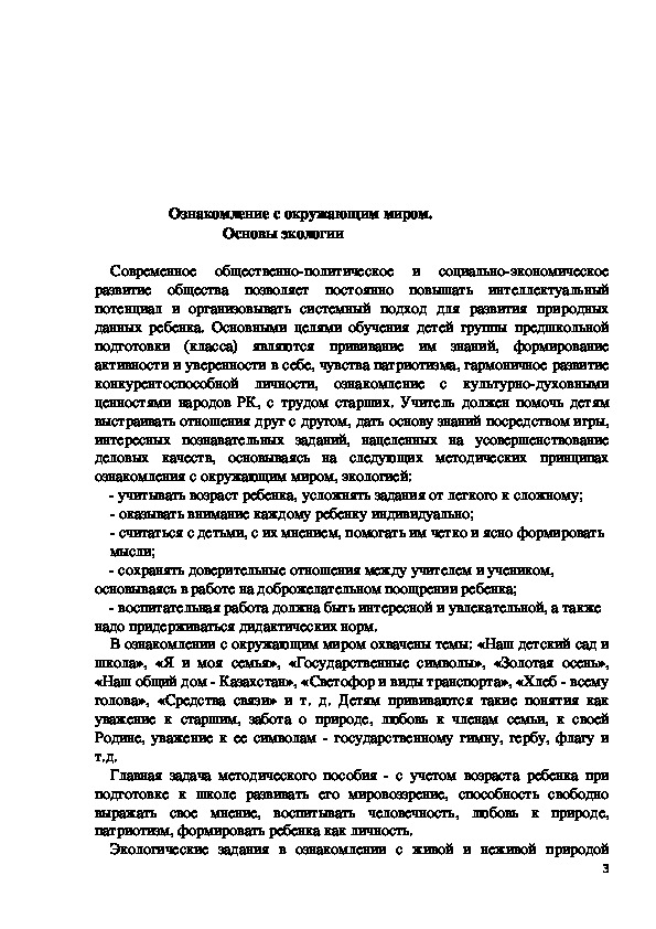 Современное общественно-политическое и социально-экономичес¬кое развитие общества позволяет постоянно повышать интеллектуаль¬ный потенциал и организовывать системный подход для развития при¬родных данных ребенка. Основными целями обучения детей группы предшкольной подготовки (класса) являются прививание им знаний, формирование активности и уверенности в себе, чувства патриотизма, гармоничное развитие конкурентоспособной личности, ознакомление с культурно-духовными ценностями народов РК, с трудом старших. Учитель должен помочь детям выстраивать отношения друг с дру¬гом, дать основу знаний посредством игры, интересных познаватель¬ных заданий, нацеленных на усовершенствование деловых качеств, основываясь на следующих методических принципах ознакомления с окружающим миром, экологией: