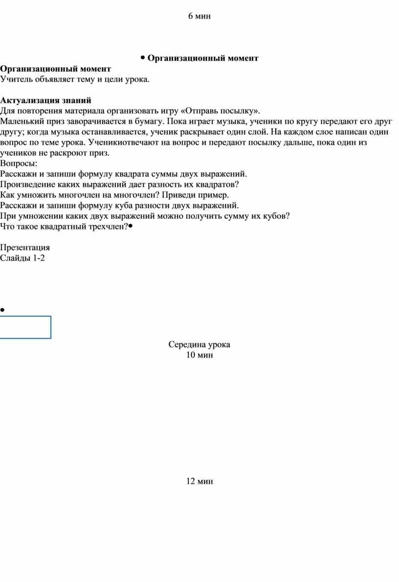Актуализация знаний Для повторения материала организовать игру «Отправь посылку». Маленький приз заворачивается в бумагу. Пока играет музыка, ученики по кругу передают его друг другу; когда музыка останавливается, ученик раскрывает один слой. На каждом слое написан один вопрос по теме урока. Ученикиотвечают на вопрос и передают посылку дальше, пока один из учеников не раскроют приз. Вопросы: Расскажи и запиши формулу квадрата суммы двух выражений. Произведение каких выражений дает разность их квадратов? Как умножить многочлен на многочлен? Приведи пример. Расскажи и запиши формулу куба разности двух выражений. При умножении каких двух выражений можно получить сумму их кубов? Что такое квадратный трехчлен? |