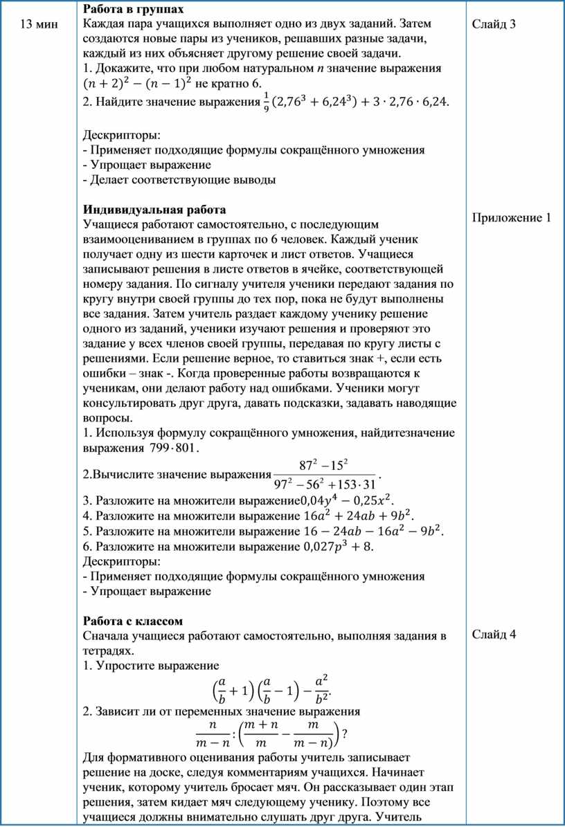 Для формативного оценивания работы учитель записывает решение на доске, следуя комментариям учащихся. Начинает ученик, которому учитель бросает мяч. Он рассказывает один этап решения, затем кидает мяч следующему ученику. Поэтому все учащиеся должны внимательно слушать друг друга. Учитель следит за правильностью использования математического языка. Дескрипторы - Находит сумму / разность дробей - Выполняет умножение / деление дробей - Применяет подходящие формулы сокращённого умножения - Упрощает выражение - Отвечает на вопрос