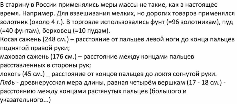 В старину в России применялись меры массы не такие, как в настоящее время. Например. Для взвешивания мелких, но дорогих товаров применялся золотник (около 4 г.). В торговле использовались фунт (=96 золотникам), пуд (=40 фунтам), берковец (=10 пудам).