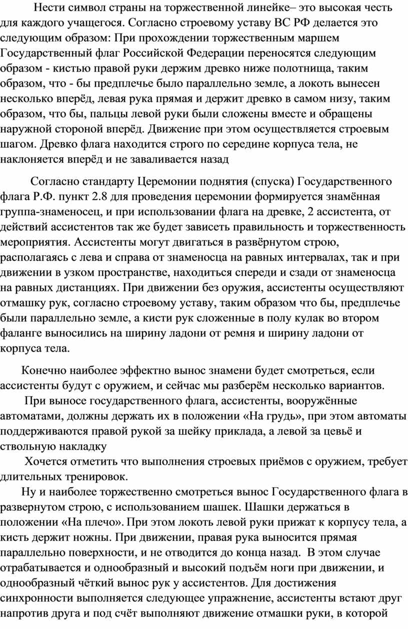 Темой своей методической разработки, я выбрал обязательный, очень, важный и торжественный церемониал, который стал традиционным в организации торжественных линеек и мероприятий, посвящённых важным событиям для страны и школьной жизни. С церемонии выноса Государственного флага Российской федерации начинается и заканчивается наша с вами рабочая и учебная неделя.