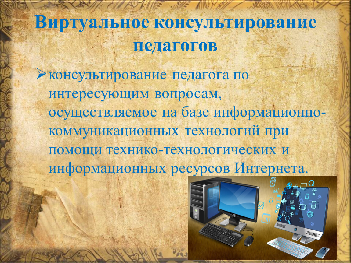 консультирование педагога по интересующим вопросам, осуществляемое на базе информационно-коммуникационных технологий при помощи технико-технологических и информационных ресурсов Интернета.