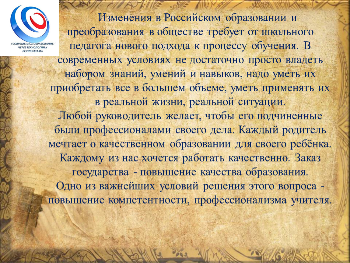 Изменения в Российском образовании и преобразования в обществе требует от школьного педагога нового подхода к процессу обучения. В современных условиях не достаточно просто владеть набором знаний, умений и навыков, надо уметь их приобретать все в большем объеме, уметь применять их в реальной жизни, реальной ситуации.