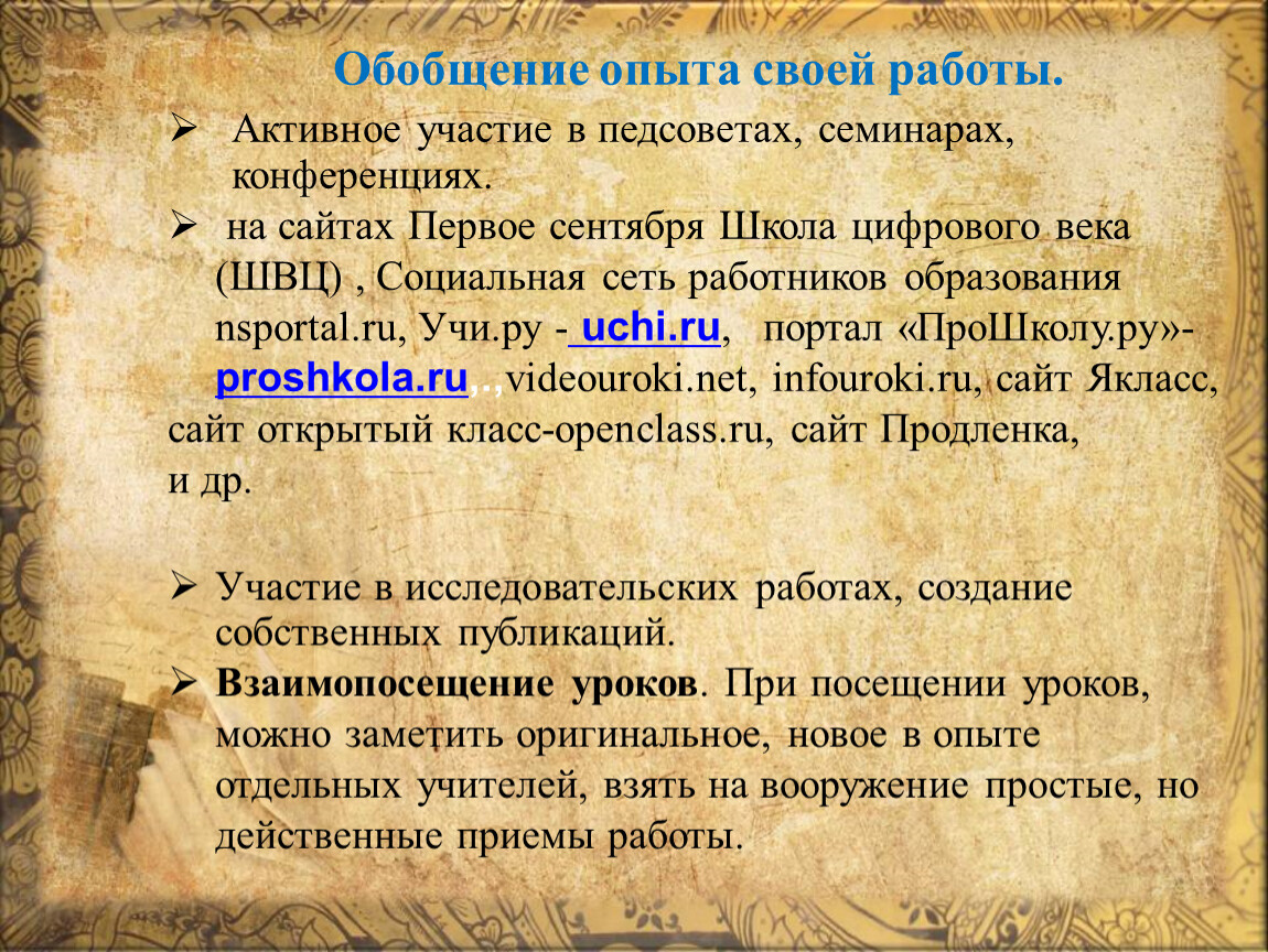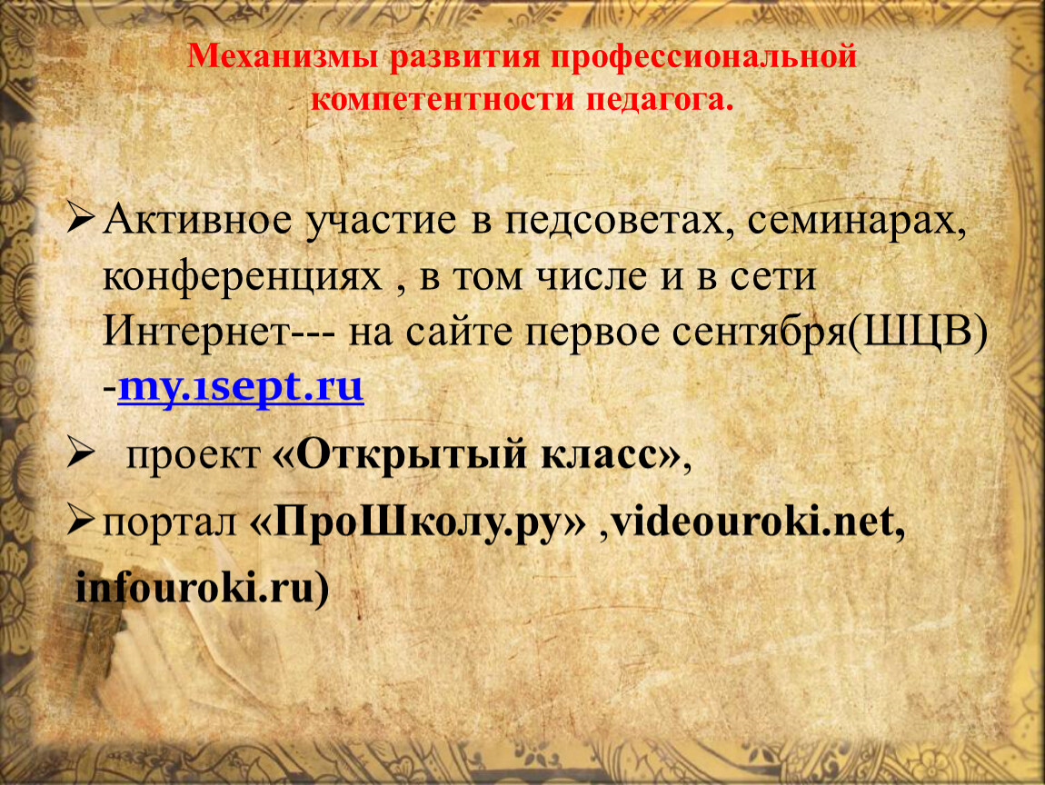 Активное участие в педсоветах, семинарах, конференциях , в том числе и в сети Интернет--- на сайте первое сентября(ШЦВ) -my.1sept.ru