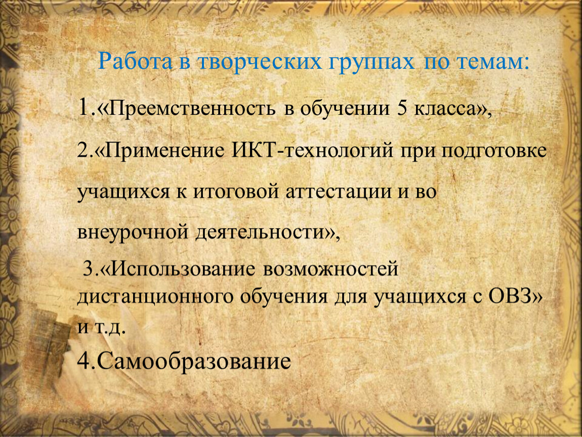 1.«Преемственность в обучении 5 класса», 2.«Применение ИКТ-технологий при подготовке учащихся к итоговой аттестации и во внеурочной деятельности»,