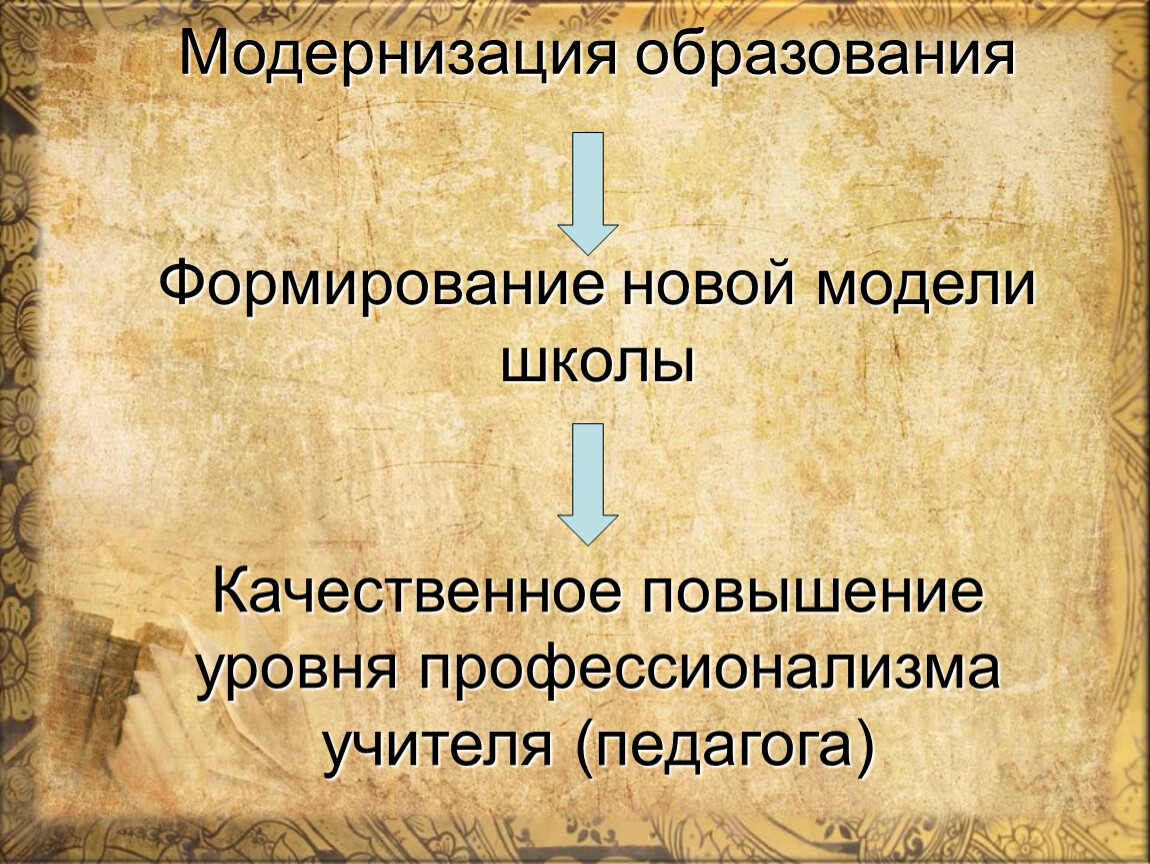 Модернизация образованияФормирование новой модели школыКачественное повышение уровня профессионализма учителя (педагога)