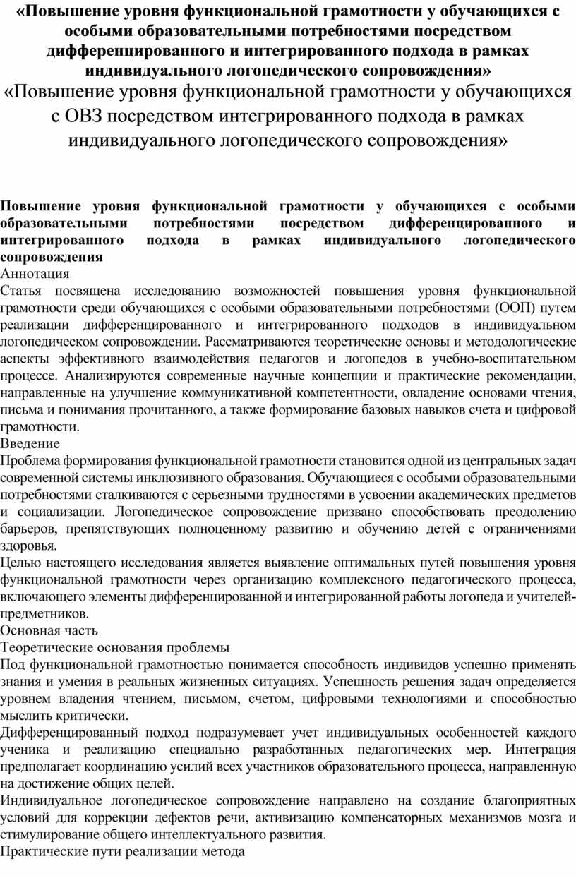 «Повышение уровня функциональной грамотности у обучающихся с особыми образовательными потребностями посредством дифференцированного и интегрированного подхода в рамках индивидуального логопедического сопровождения»