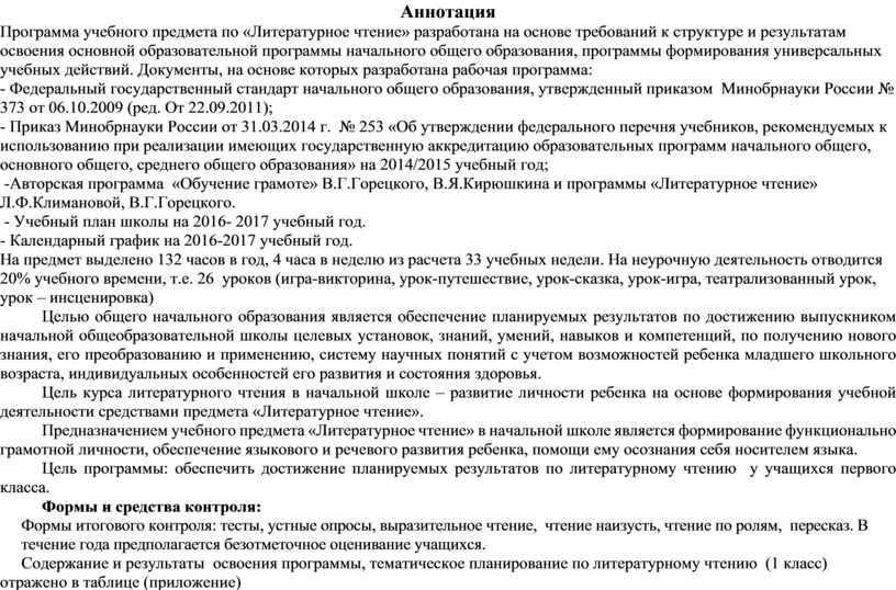 Программа учебного предмета по «Литературное чтение» разработана на основе требований к структуре и результатам освоения основной образовательной программы начального общего образования, программы формирования универсальных учебных действий. Документы, на основе которых разработана рабочая программа: