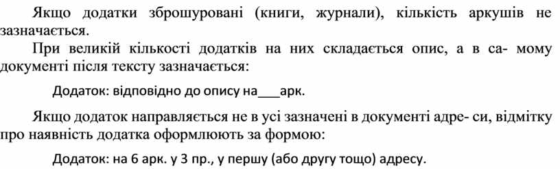 Якщо документ має додатки, які не названо в тексті, то їх наймену- вання необхідно перерахувати після тексту із зазначенням кількості ар- кушів у кожному додатку та кількості їх примірників, наприклад: