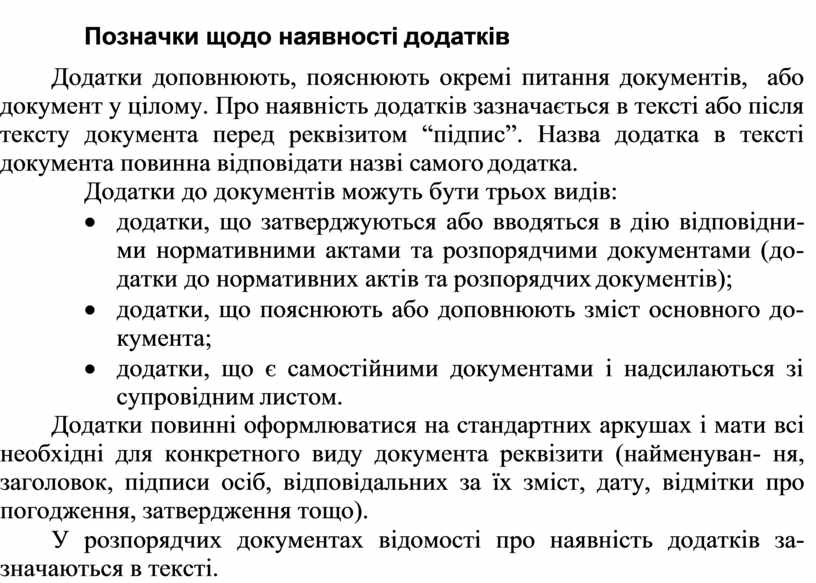 Додатки доповнюють, пояснюють окремі питання документів, або документ у цілому. Про наявність додатків зазначається в тексті або після тексту документа перед реквізитом “підпис”. Назва додатка в тексті документа повинна відповідати назві самого додатка.