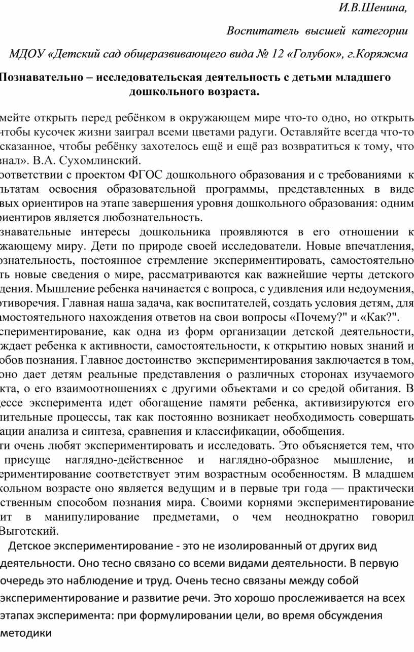 Интенсивное развитие детского экспериментирования во всех его видах и формах - является необходимым условием успешного становления личности младшего дошкольника, развитию его познавательного интереса, воспитанию потребности к целостному восприятию окружающего мира.