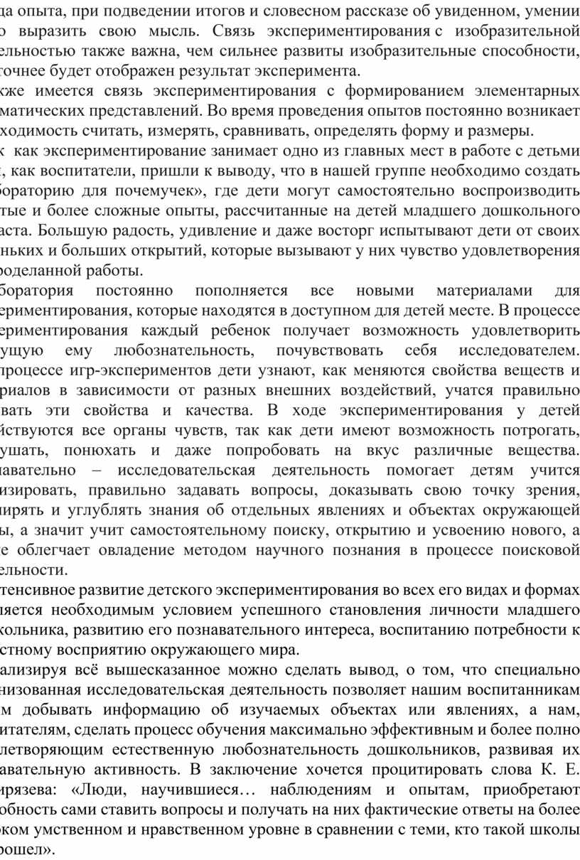 Анализируя всё вышесказанное можно сделать вывод, о том, что специально организованная исследовательская деятельность позволяет нашим воспитанникам самим добывать информацию об изучаемых объектах или явлениях, а нам, воспитателям, сделать процесс обучения максимально эффективным и более полно удовлетворяющим естественную любознательность дошкольников, развивая их познавательную активность. В заключение хочется процитировать слова К. Е. Тимирязева: «Люди, научившиеся… наблюдениям и опытам, приобретают способность сами ставить вопросы и получать на них фактические ответы на более высоком умственном и нравственном уровне в сравнении с теми, кто такой школы не прошел».