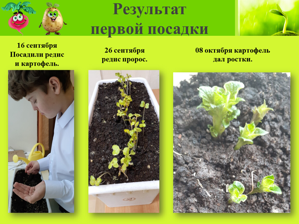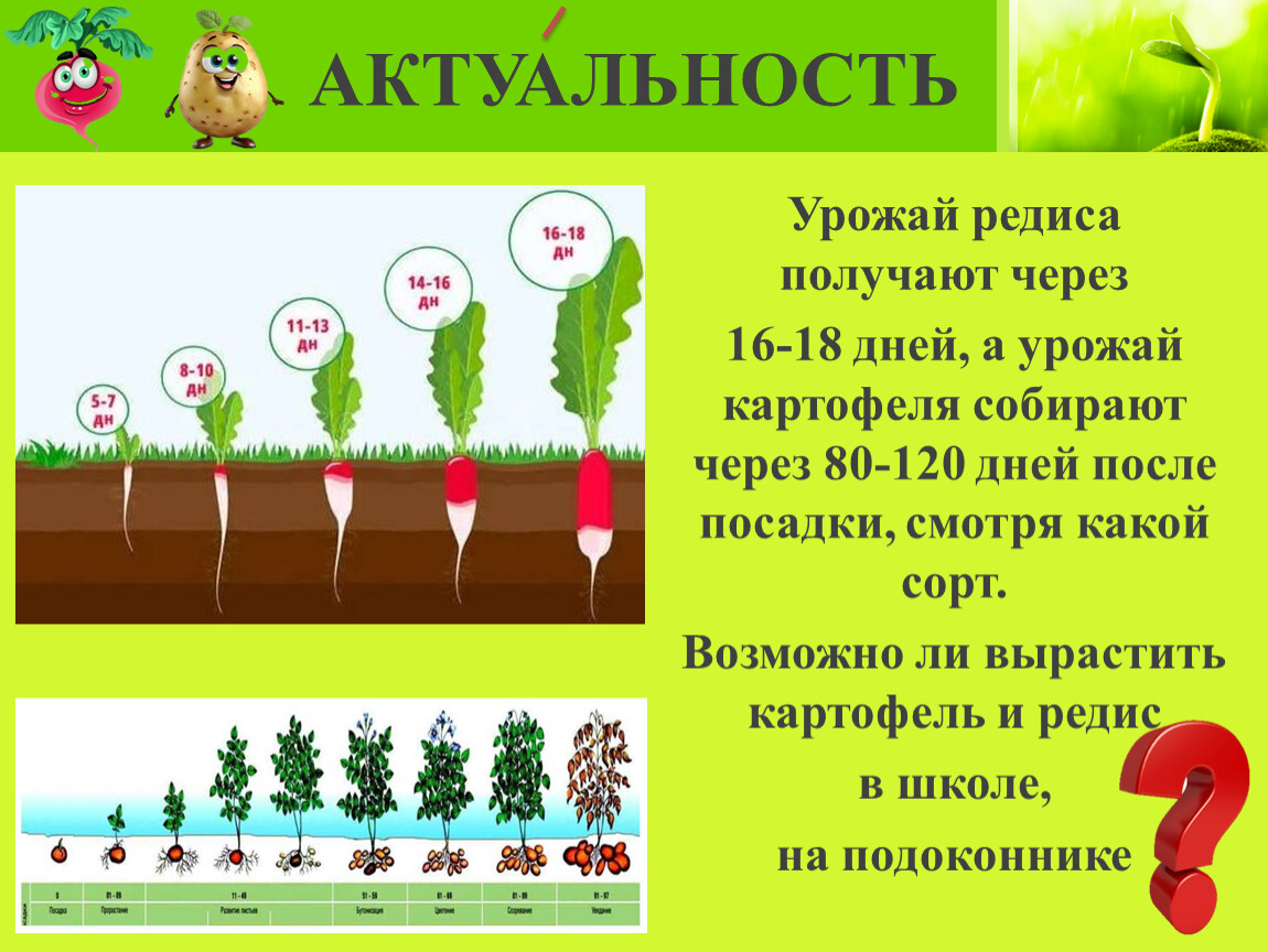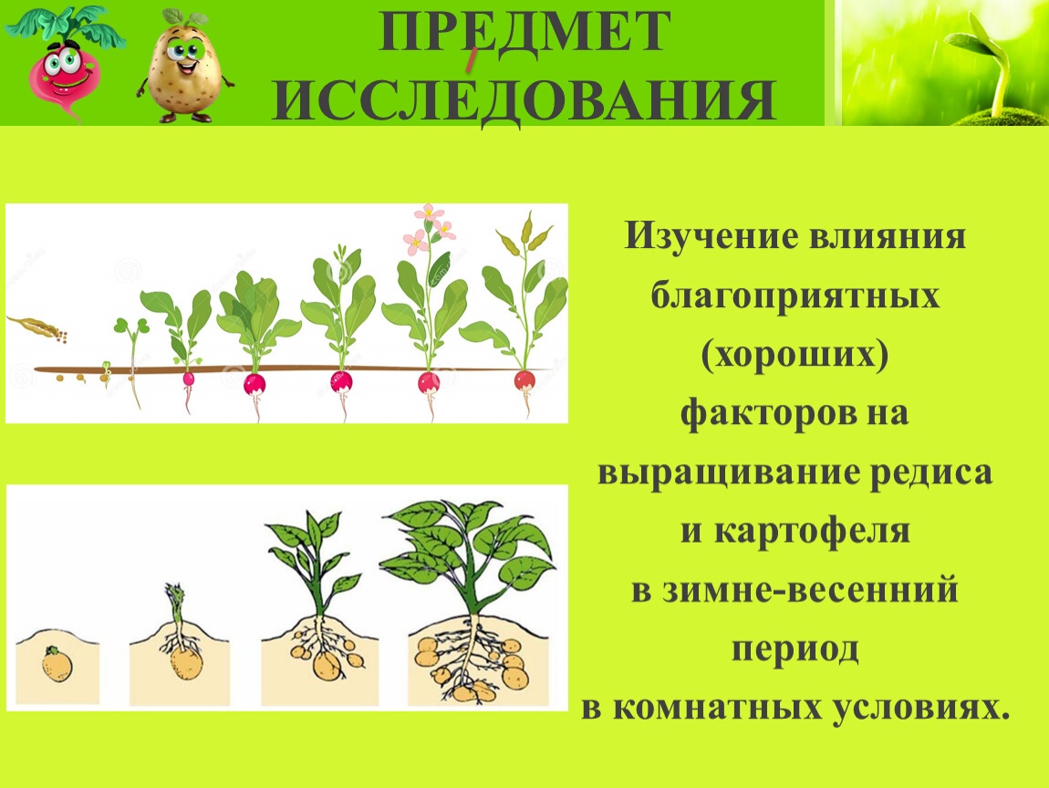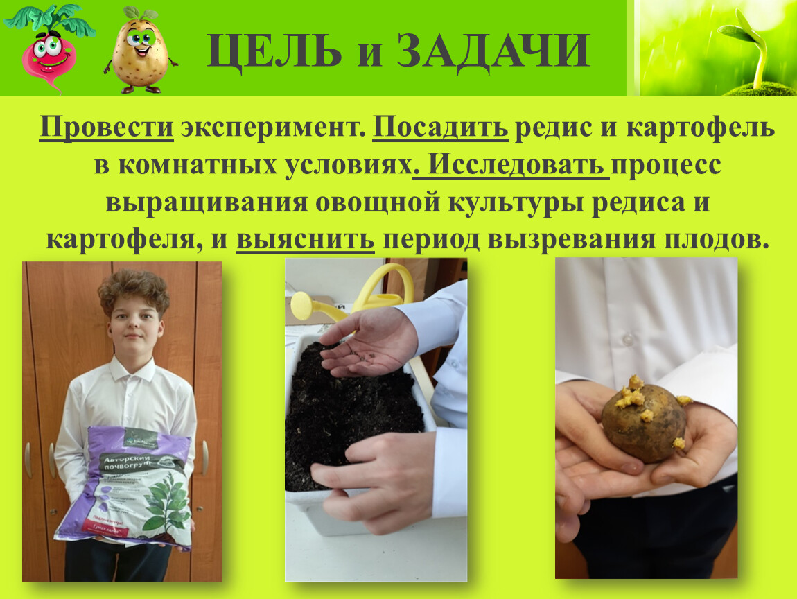 Провести эксперимент. Посадить редис и картофель в комнатных условиях. Исследовать процесс