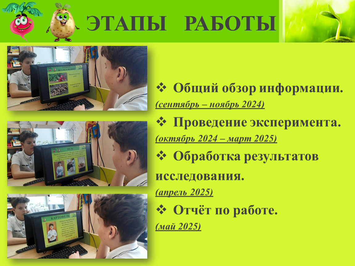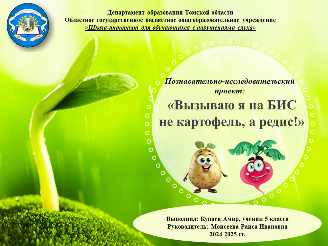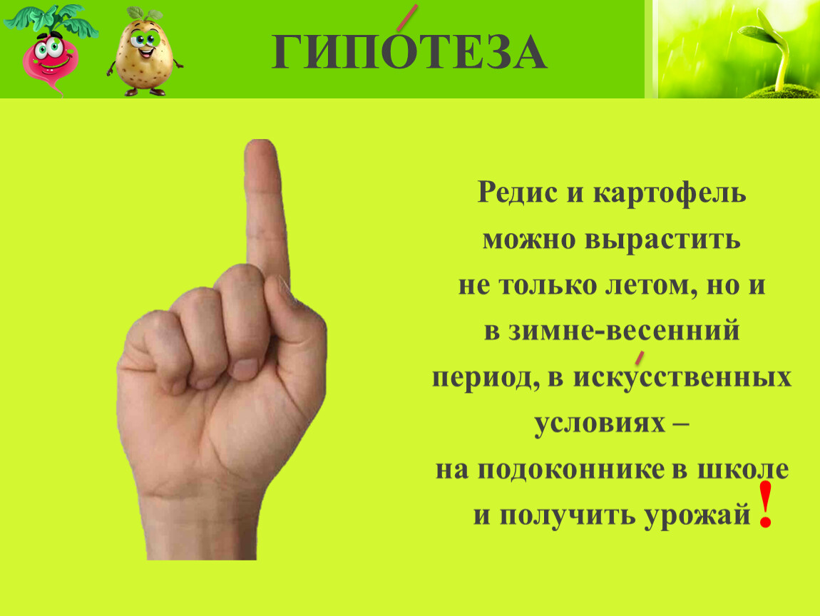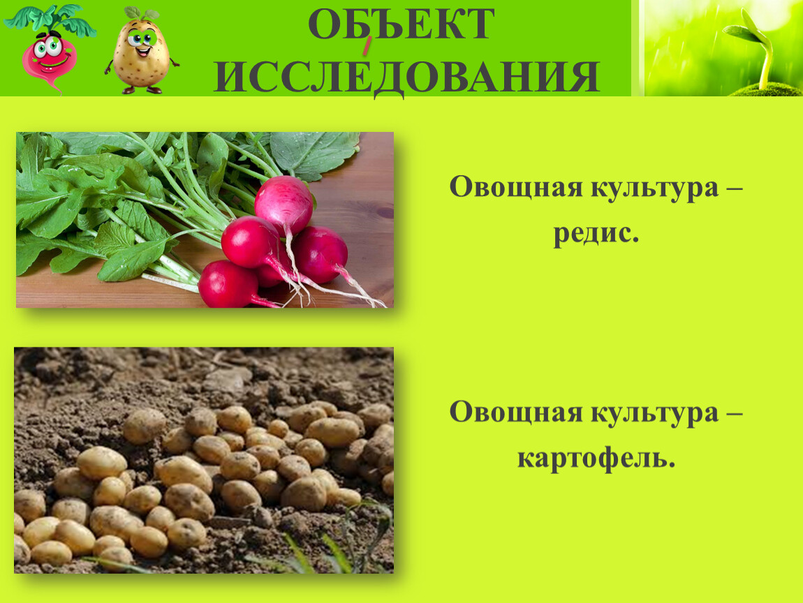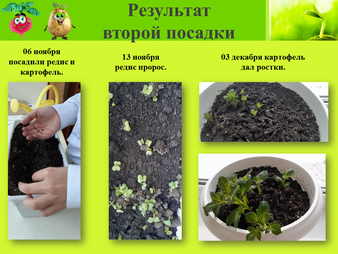 Провести эксперимент. Посадить редис и картофель в комнатных условиях. Исследовать процесс
