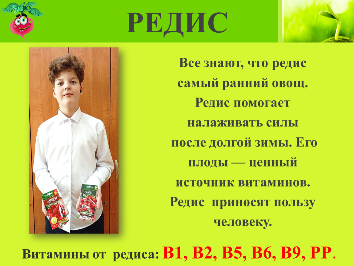 Витамины от редиса: B1, B2, B5, B6, B9, PP.