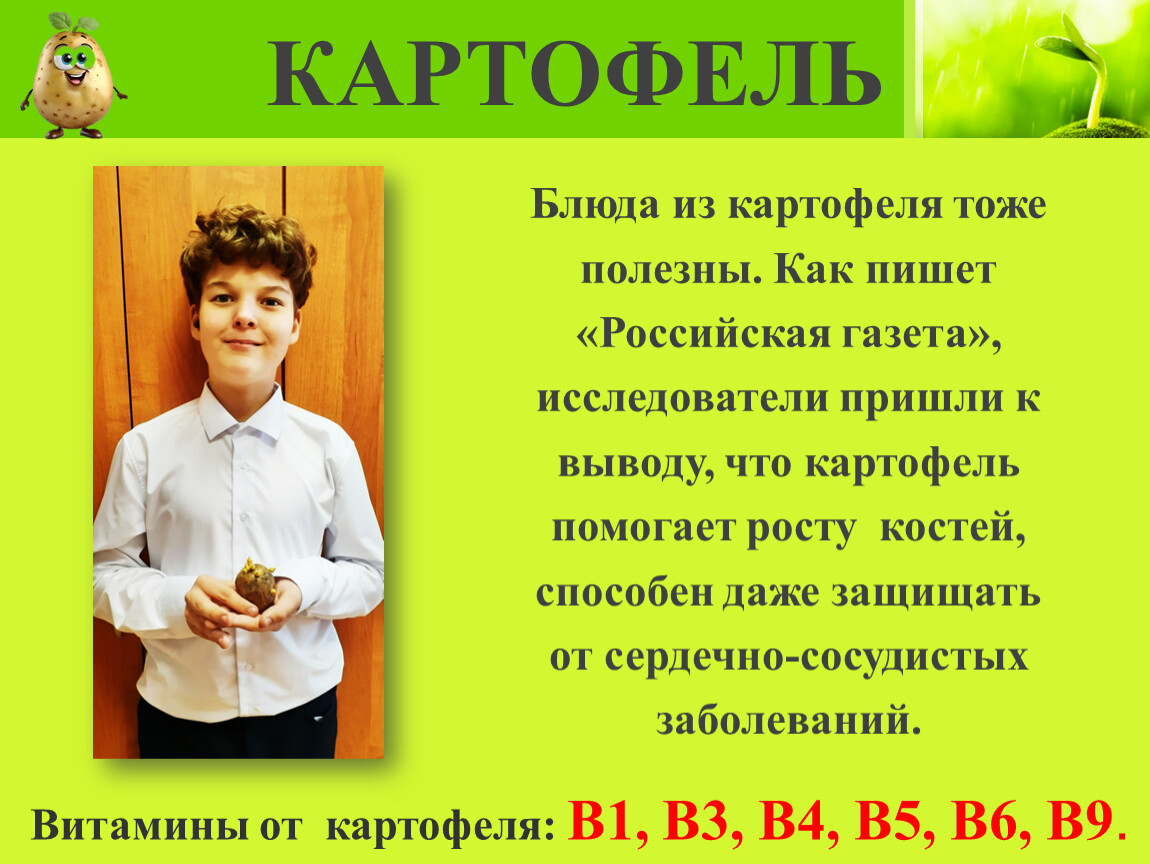 Витамины от картофеля: B1, B3, B4, B5, B6, В9.
