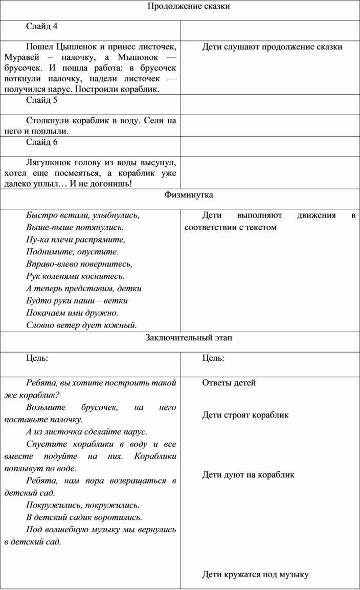 Ребята, вы хотите построить такой же кораблик? Возьмите брусочек, на него поставьте палочку. А из листочка сделайте парус. Спустите кораблики в воду и все вместе подуйте на них. Кораблики поплывут по воде. Ребята, нам пора возвращаться в детский сад. Покружились, покружились. В детский садик воротились. Под волшебную музыку мы вернулись в детский сад. |