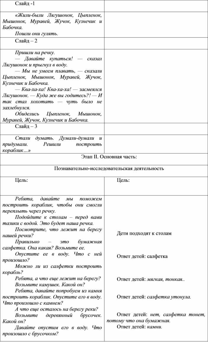 Ребята, давайте мы поможем построить кораблик, чтобы они смогли переплыть через речку. Подойдите к столам – перед вами тазики с водой. Это будет наша речка. Посмотрите, что лежит на берегу нашей речки? Правильно – это бумажная салфетка. Она какая? Возьмите ее. Опустите ее в воду. Что с ней произошло? Можно ли из салфетки построить корабль? Ребята, а что еще лежит на берегу? Возьмите камушек. Какой он? Ребята, давайте попробуем из камня построить кораблик. Опустите его в воду. Что произошло с камнем? А что еще осталось на берегу реки? Возьмите деревянный брусочек. Какой он? Давайте опустим его в воду. Что произошло с брусочком? Ребята, из чего можно построить кораблик и почему? Ребята, давайте вернемся к нашей сказке. |