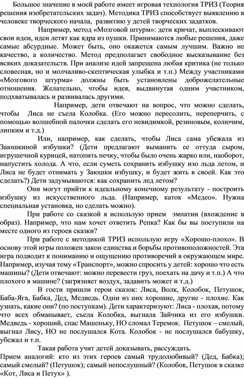 Большое значение в моей работе имеет игровая технология ТРИЗ (Теория решения изобретательских задач). Методика ТРИЗ способствует выявлению в человеке творческого начала, развитию у детей творческих задатков.