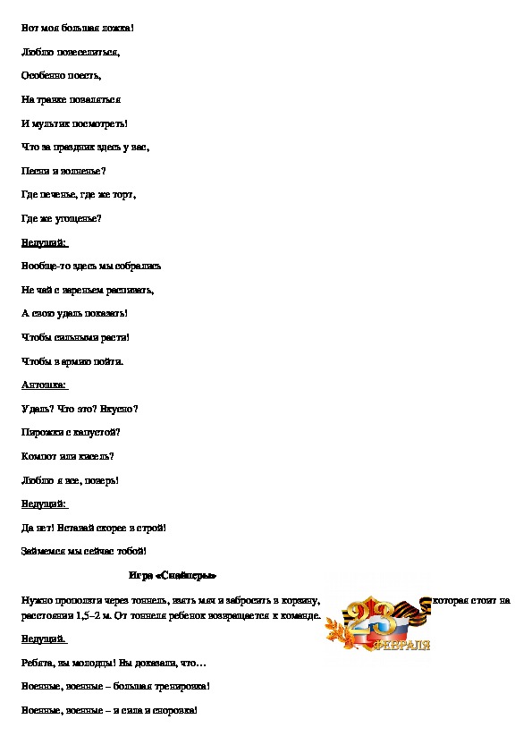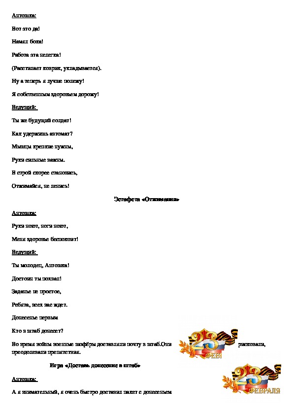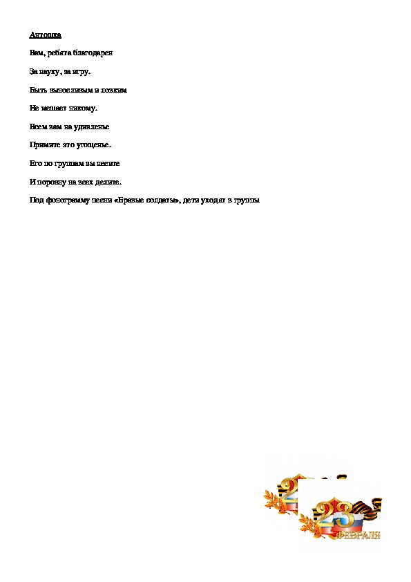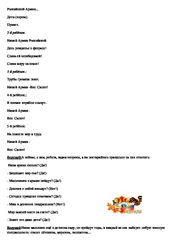 ! Сегодня мы собрались в этом зале, чтобы всей страной отметить День рождения Российской Армии. Любит свою армию российский народ. Она охраняет мирный труд страны, стоит на страже мира. Много бесстрашных полководцев и наших рядовых воинов проявили себя героями в годы Великой Отечественной войны. Их имена знает вся страна. Ими гордится вся Россия! Ведь защитники должны быть сильными, смелыми, умными. Смелыми – чтоб не испугаться врага, сильными – чтобы победить его, а умными – чтобы правильно обращаться с оружием. В честь нашей армии мы начинаем праздник «День защитника Отечества»