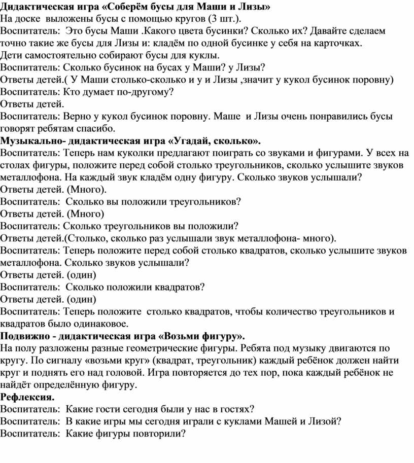 Воспитатель: Сегодня, ребята, к нам в гости пришли две подружки куклы Маша и Лиза. Мы будем сегодня играть вместе с ними. Вы рады? Как зовут кукол?