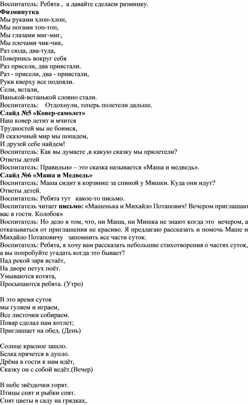 Воспитатель: Но дело в том, что, ни Маша, ни Мишка не знают когда это вечером, а отказываться от приглашения не красиво. Я предлагаю рассказать и помочь Маше и Михайло Потаповичу запомнить все части суток.
