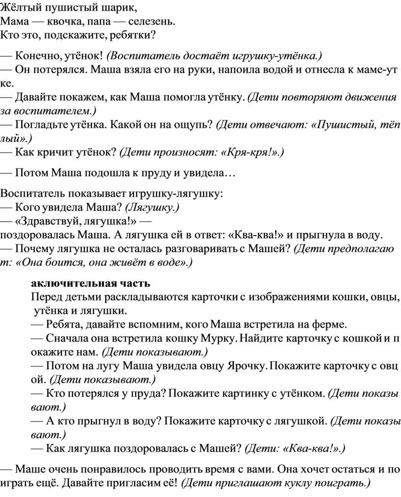 — Давайте покажем, как Маша помогла утёнку. (Дети повторяют движения за воспитателем.)