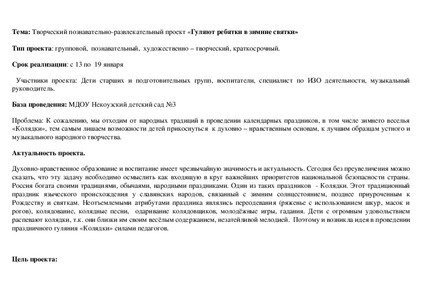 Цель проекта:Познакомить детей с праздником «Рождество Христово» и следующим за ним праздником «Рождественские Святки», «