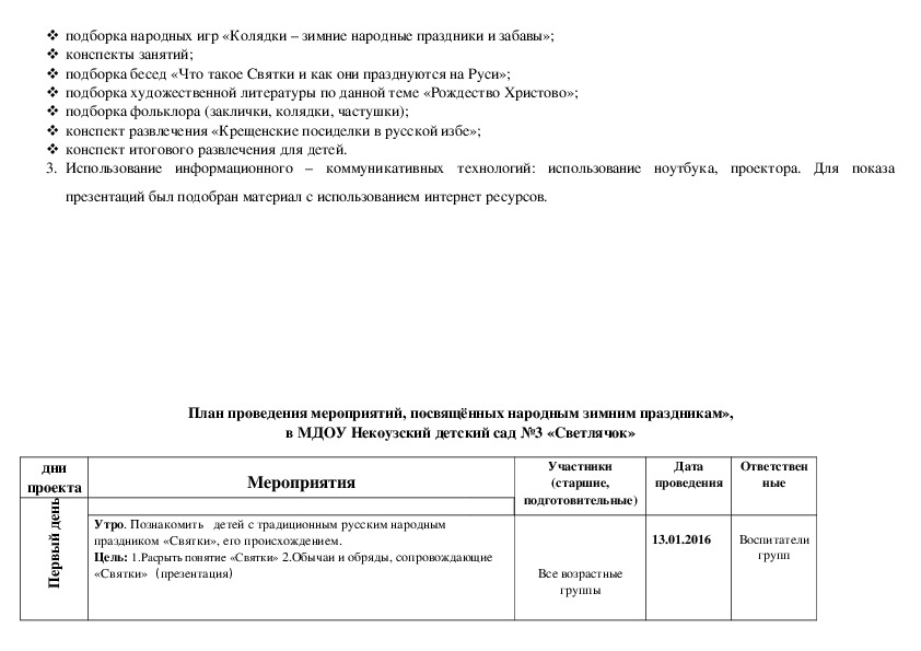 План проведения мероприятий, посвящённых народным зимним праздникам»,
