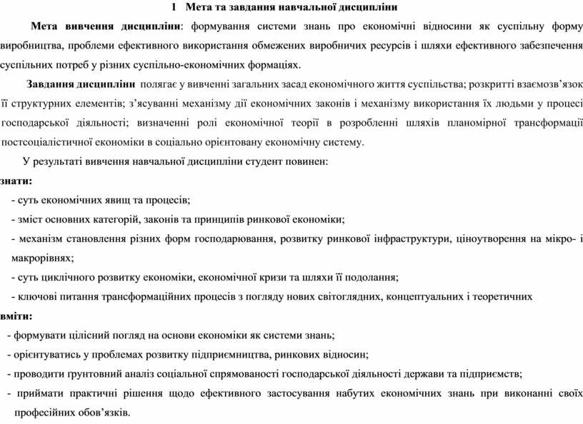 Мета вивчення дисципліни: формування системи знань про економічні відносини як суспільну форму виробництва, проблеми ефективного використання обмежених виробничих ресурсів і шляхи ефективного забезпечення суспільних потреб у різних суспільно-економічних формаціях.
