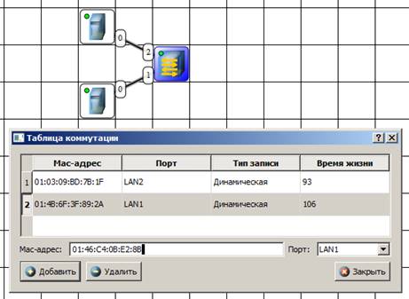 Свойства коммутатора. Откроем его таблицу коммутации (рис. 17). Сейчас она абсолютно пустая, т.к. не было ни одной передачи данных. Но при этом у нас есть возможность добавить статическую запись, для этого необходимо заполнить все поля соответствующими данными и нажать кнопку "Добавить".